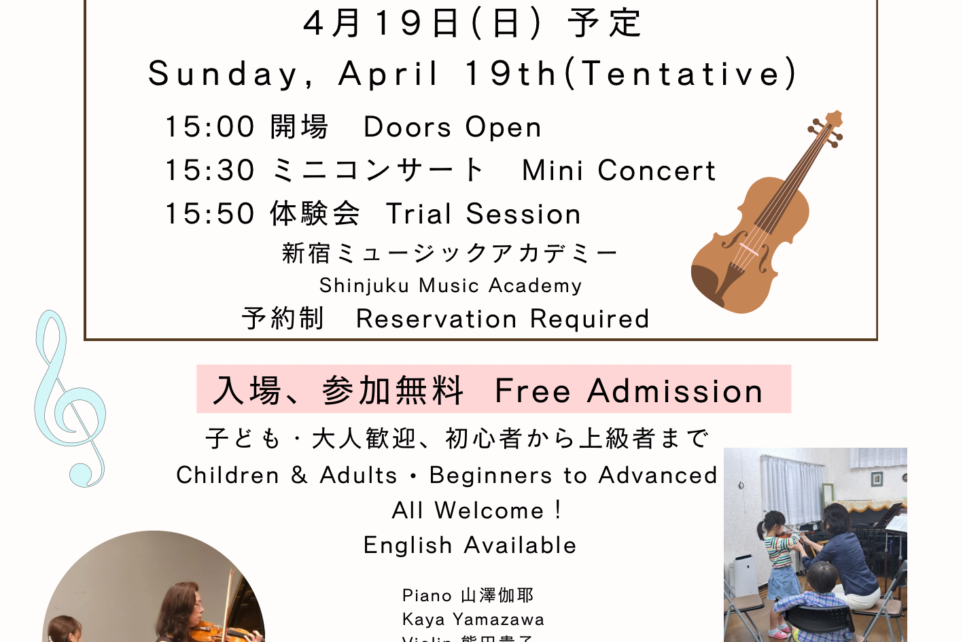 I’m happy to announce a special musical event in Shinjuku this spring! Together with pianist Kaya Yamazawa, we will present a Piano & Violin Mini Concert and Trial Session at